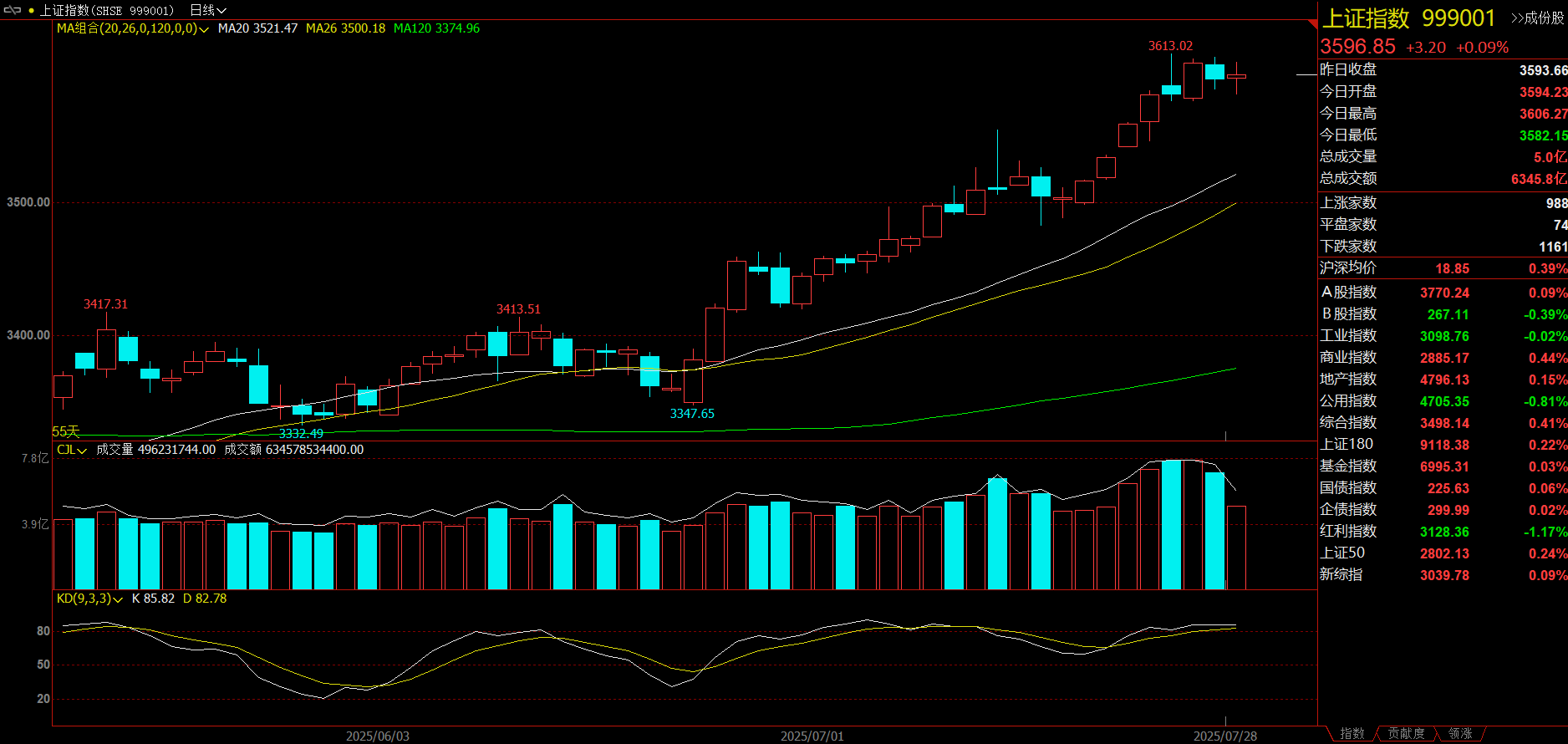 指数上周在近期几大主线大金融、反内卷,雅下水电概念的轮番活跃下,连续上涨,随着不过它们基本告一段落,周五终于还是出现了盘整。在周末利空利好五五开下,今天上午大盘冲高回落,走势比较震荡,那么这样可能还有个调整的过程,对于3600要做好拉锯的准备,但量能目前是打开了,慢牛正在路上,大盘总体是积极的。