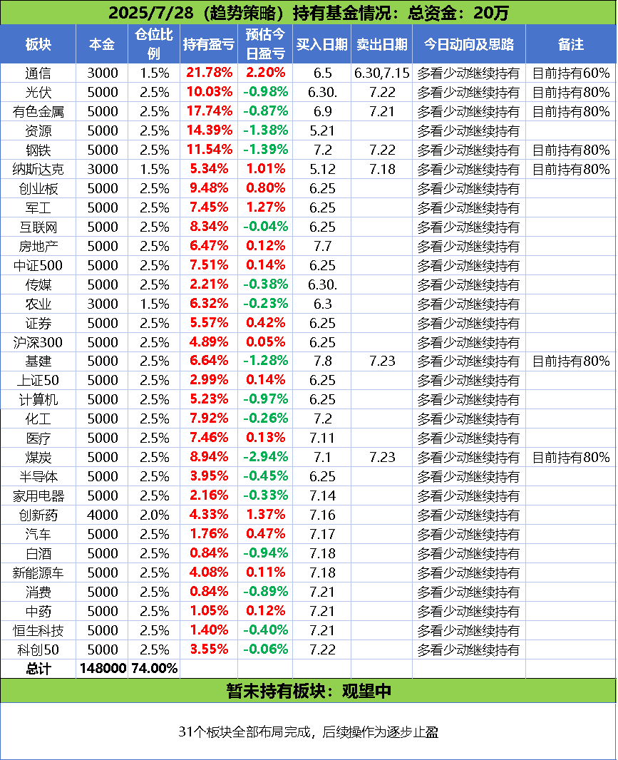 场内做久了,另做了套策略拿来做场外,总共准备了20万资金,截止到7月23日,布局的31个板块都已经入场,目前反馈还不错。