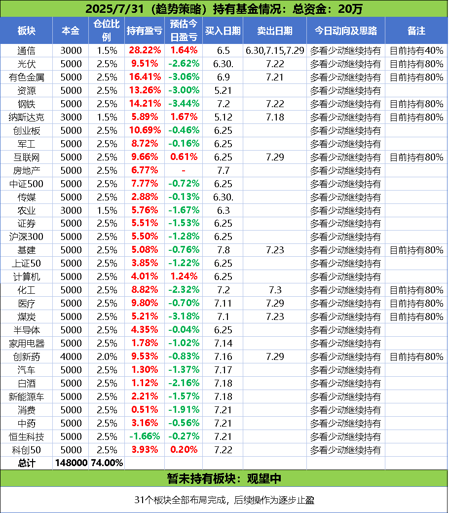 场内做久了,另外做了套策略拿来做场外,总共准备了20万资金,截止到7月23日,布局的31个板块都已经入场,目前反馈还不错。