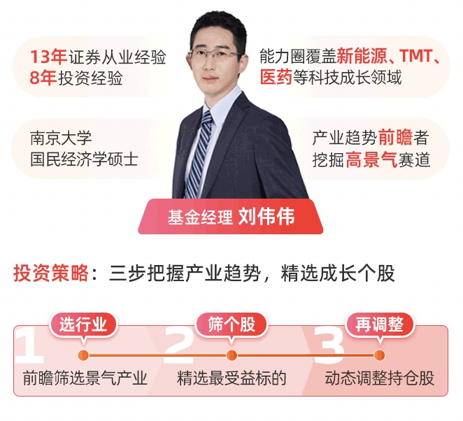 基金经理刘伟伟,13年证券从业经验,8年投资经验,擅长挖掘科技成长领域投资机会,长期深度研究新能源、机械、汽车行业,同时熟悉电子、通信等行业,擅长从产业趋势出发,寻找高景气成长机遇。