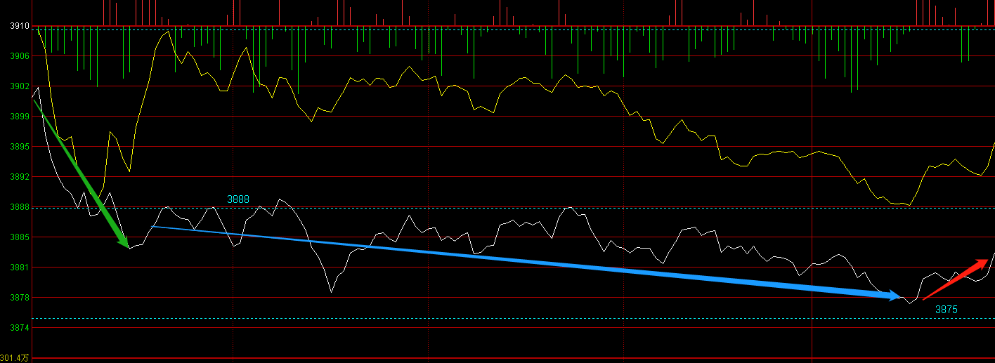 最高至上行到预设下线3909的下方3606.12点,显弱。