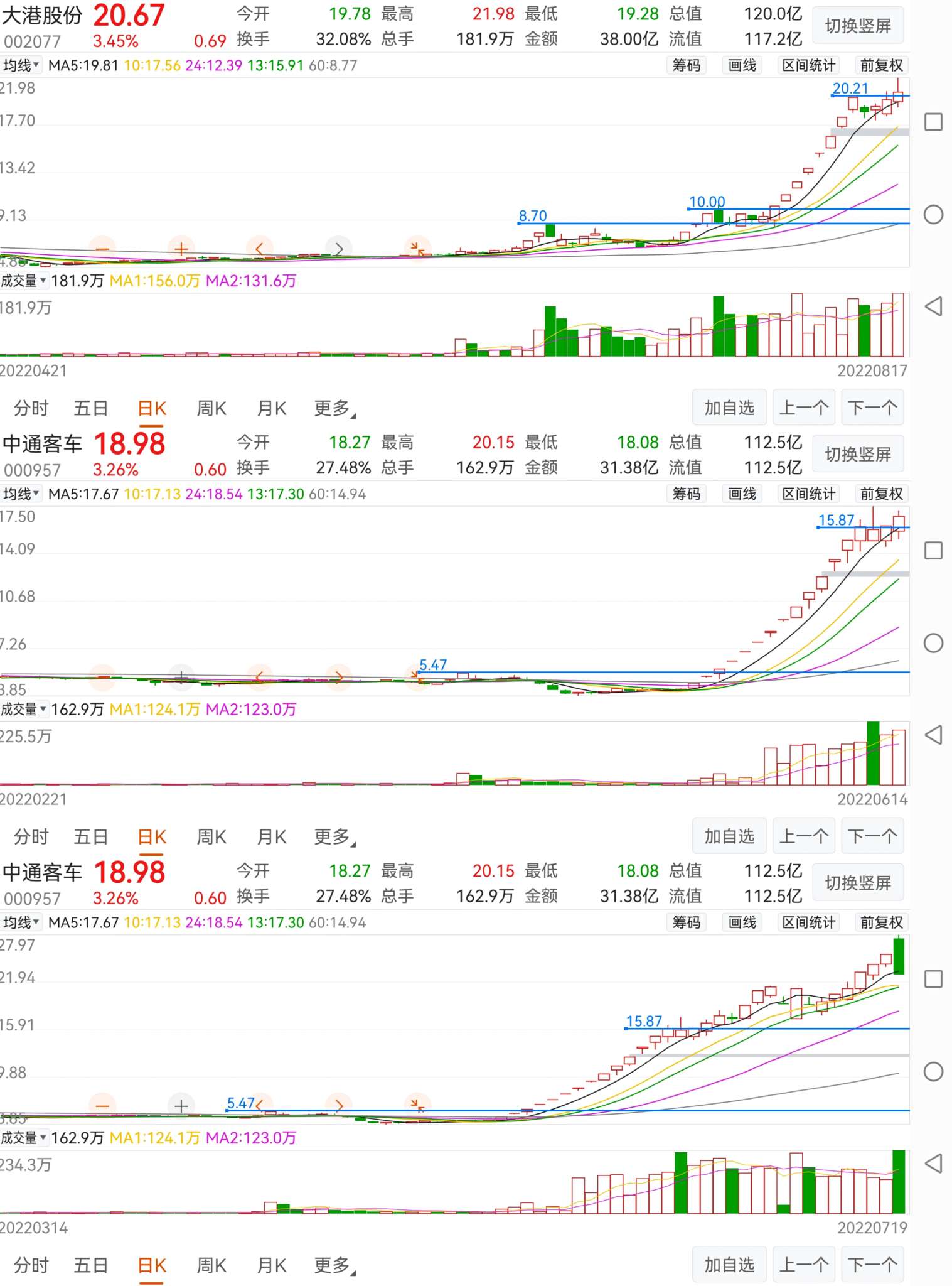 大港股份是芯片半导体Chiplet的领涨龙头股,其地位相当于汽车板块起动初期的领涨龙头股中通客车!中通客车在连板拉升断板后进入一个短暂的横盘震荡休整期,经过6个交易日的高位横盘震荡后再次两连板拉升,之后延续了一个月左右的震荡上攻走势,最终涨幅定格在起动最低点的7倍左右!大港股份起动最低价是4.85元,其最终涨幅应该在六七倍左右,如果是6倍,其目标位大概在30元左右,目前价位还有5板左右的上升空间,因此半导体芯片Chiplet的炒做还远未到行情终结的时候,板块的热度也许才刚刚开始,这里会出现一只接力大港股份的新龙头出现!就象机器人题材炒做一样,机器人领涨龙头巨轮智能见顶前最后一个涨停板拉升也就是中大力德起动涨停板的出现,中大力德成为巨轮智能之后的新一只机器人板块的领涨龙头,期间还出现一只跟涨龙头鸣志电器!