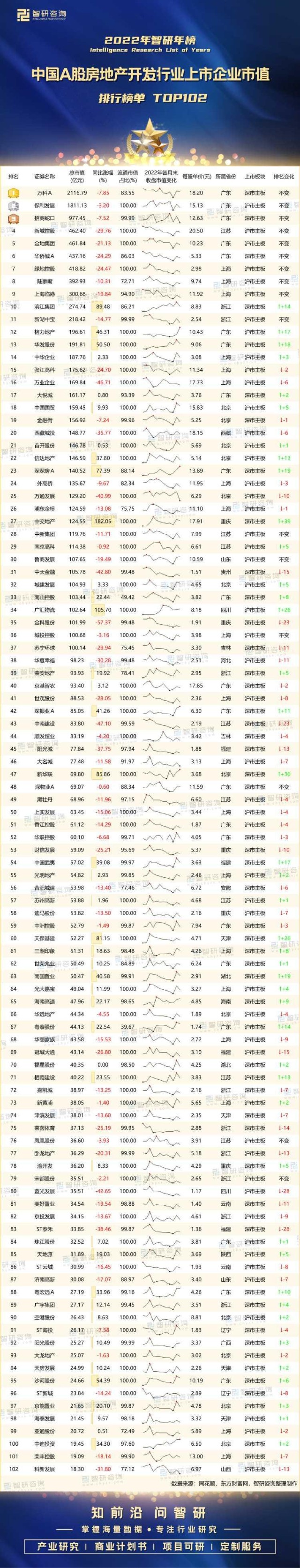 2022年,A股市场102家房地产开发行业市值共计1.45万亿元,占A股市场总市值的比重为1.65%,较2021年房地产开发行业的企业总市值减少9.34%。