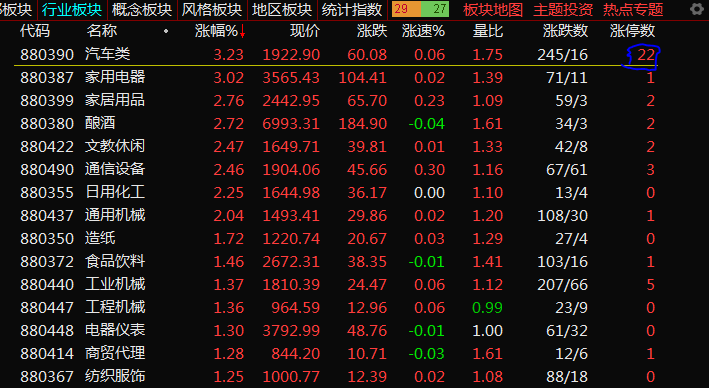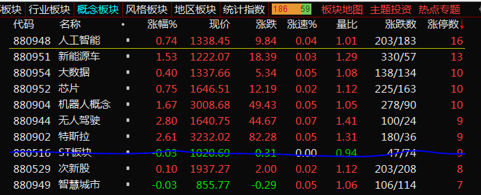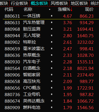 热点板块藏战机,行业板块涨幅前五为汽车类、家用电器、家居用品、酿酒、文教休闲;概念板块涨幅前五为一体压铸、汽车热处理、胎压监测、无人驾驶、特斯拉;概念板块涨停家数前五为:人工智能16家、新能源车13家、大数据10家、芯片10家、机器人概念10家。