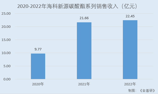 2020-2022年,海科新源核心产品碳酸酯系列的销售收入分别为9.77亿元、21.66亿元、22.45亿元,年均复合增长率达51.63%,增长态势良好。