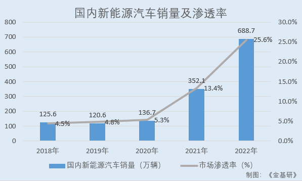 视线回到国内,国内新能源汽车发展势头强劲,是全球增长最快的市场。据中汽协数据,2018-2022年,国内新能源汽车销量分别为125.6万辆、120.6万辆、136.7万辆、352.1万辆、688.7万辆,市场渗透率分别为4.5%、4.8%、5.3%、13.4%、25.6%。