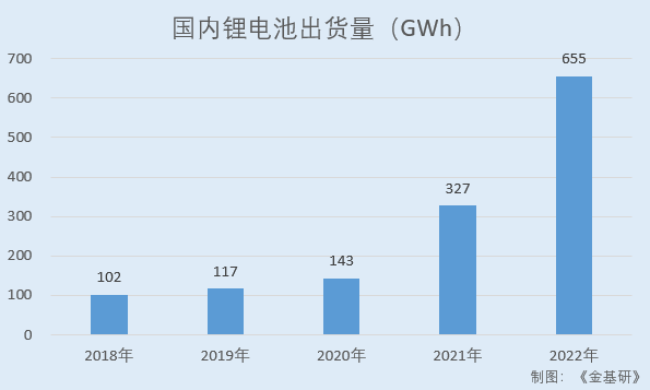 另据高工锂电数据,2018-2022年,国内锂电池出货量分别为102 GWh、117 GWh、143 GWh、327 GWh、655 GWh。其中,2022年国内锂电池出货量同比增长100%。