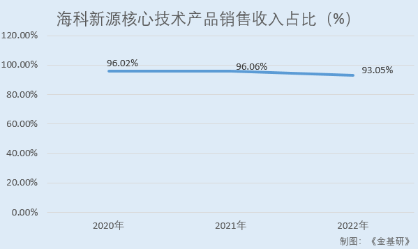 2020-2022年,海科新源核心技术相关的产品销售收入占主营业务收入的比例分别为96.02%、96.06%、93.05%。