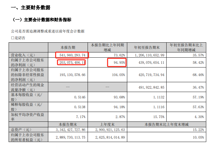 三季度营业收入5.4亿元,同比增加73.62%,净利润2.03亿元,同比增加94.95%;