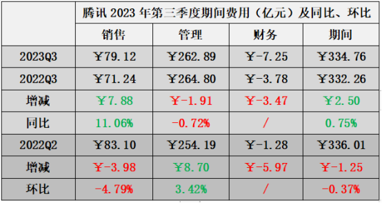 2023年第三季度,腾讯期间费用合计334.76亿元,同比微增0.75%,环比微降0.37%: