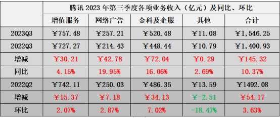 2023年第三季度,腾讯总营收1546.25亿元,同比增加145.32亿元(+10.37%);环比增加54.17亿元(+3.63%);