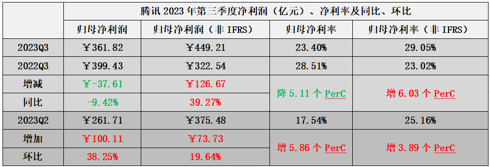 2023年前三季度,腾讯归母净利率23.4%,同比降5.11个百分点,环比增5.86个百分点;非IFRS下同比增6.03个百分点,环比增3.89个百分点。