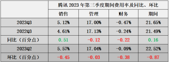 2023年第三季度,腾讯期间费用率为21.65%,同比微增0.16个百分点,主要在于销售边际效益下降所致;环比二季度下降0.87个百分点,主要还是销售费用进一步优化(砍业务)所致..(低营收增长配负费用增长)