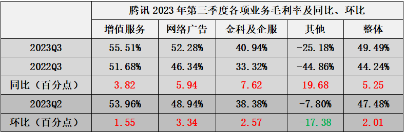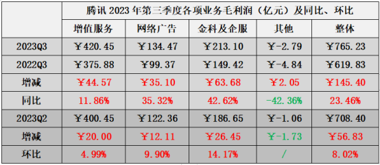 2023年第三季度,腾讯毛利润765.23亿元,同比+23.46%,环比+8.02%,皆高于营收;整体毛利率为49.49%,同比+5.25个百分点,环比+2.01个百分点。毛利增速高于营收且毛利率增长,主要在于(1)成本基本持平;(2)业务结构向高毛利率转移。