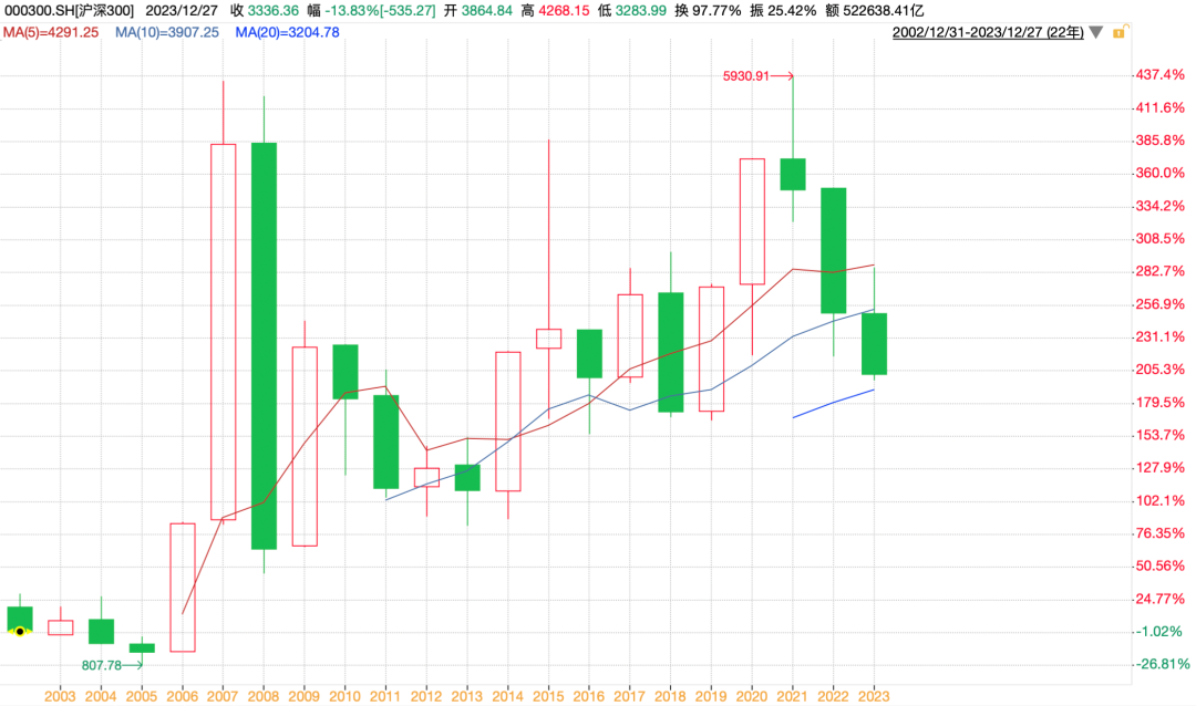 关于沪深300,过去有几条铁律,比如月线从来没有出现过5连阴,年线没有3连阴。