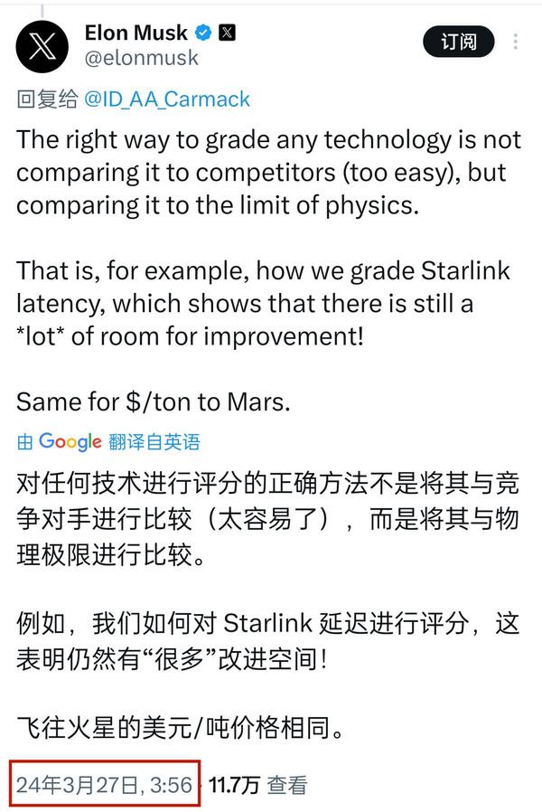 不过在调查后笔者发现,真相其实并不是这样,这只是一个偶然的巧合罢了。马斯克这这段话其实是回应国外一网友,与小米汽车的发布和雷军的对比并没有任何关联。从该网友的原文可知,秒时间应该是在与其谈论专业的技术问题。此外,还有一点也能证明马斯克的言论与小米汽车发布会无关,那就是马斯克发布该言论的时间为24年3月27日3:56,就算是美国当地时间,也是在小米3月28日晚19点发布会之前,难道马斯克还能未卜先知?