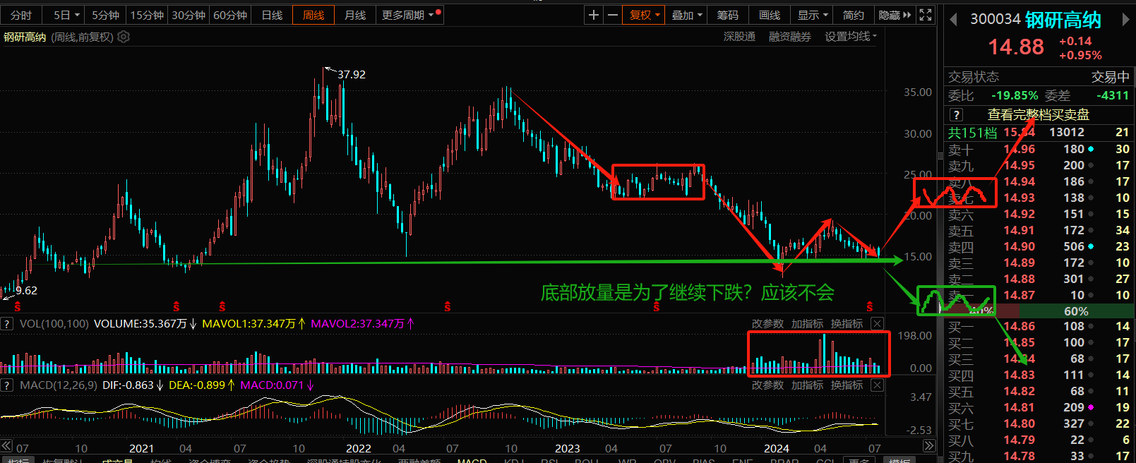 后市该票的主力是散户要齐心协力,不要轻易抛筹,长线思维一定能吃到肉,此股基本面非常好,大股东是国家队,不用担心。整体图形是在底部且伴有放量,你觉得底部放量是为了什么?个人认为有资金想试探做多,当下最好的策略就是等,做耐心资本。