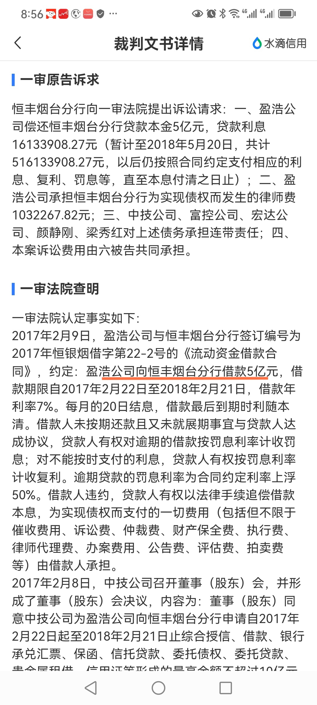 中技集团已经破产,恒丰银行10亿的本息一分都没收回!被颜静刚骗走了,恒丰银行亏大,得不到清偿,法院执行不了,案子终本。