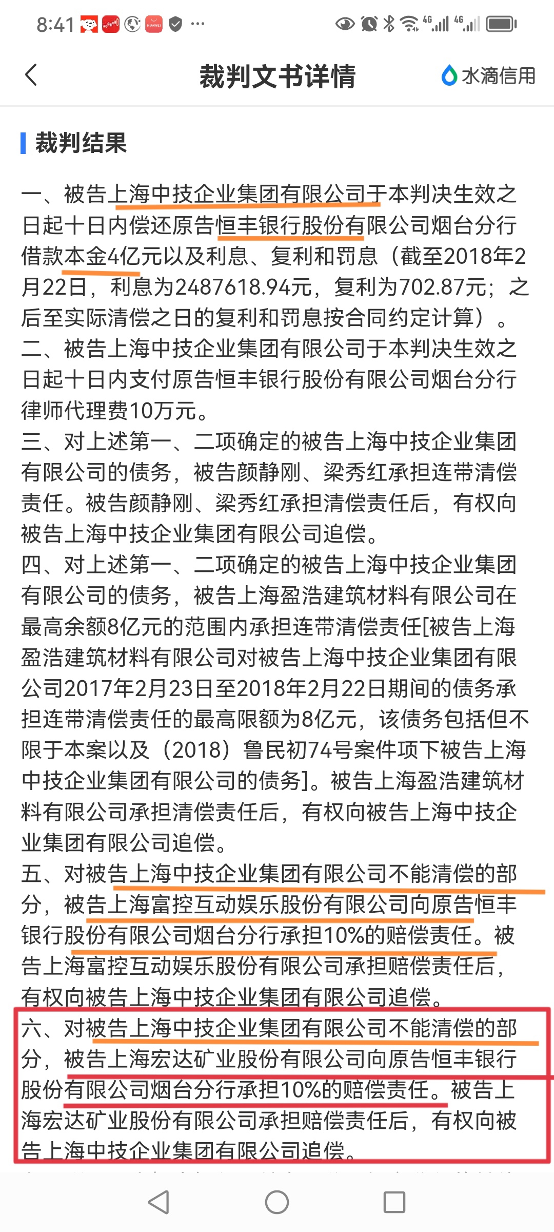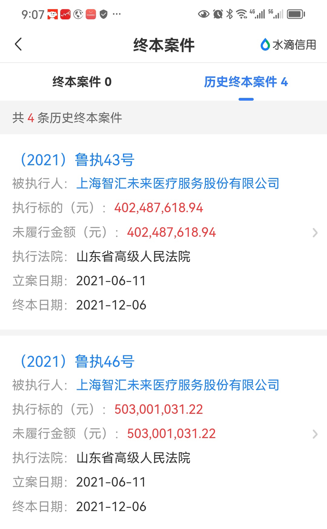 一、原未来控股股东中技集团向恒丰银行借款4亿未能归还全部本息,未来智慧医疗公司要承担10%的连带清偿责任,此案法院已经终本。