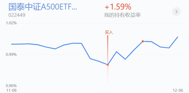 指数,我继续定投$国泰中证A500ETF联接I$2000元,汇报一下,通过前期定投我这只基已经实现了1.59%的盈利,叠加市场上的各种利好,市场预期今年出现跨年行情的概率比较大,而且重要会议马上来了,市场对于会议的定调也比较关注,在行情起飞之前我先加一波子弹,继续布局A500防止踏空行情了。不仅如此,中证A500的行业分布均衡,主要行业是银行、电子、电力设备、食品饮料和医药生物,传统行业和新兴行业差不多各占一半,风格也比较均衡,是一个难得的指数,很有机会成为我们市场上下一个门面指数。我之前选择国泰A500这只品,是因为它的表现比其他同类稳一些且收益高一些,而且当前目标ETF规模超过280亿元,累计成交突破了1000亿元大关,继续保持在全市场22只跟踪中证A500产品中的领先地位,还可以领包国泰基金财富号粉丝中心,讨论区6楼也有,我今日领了包继续定投一份了。