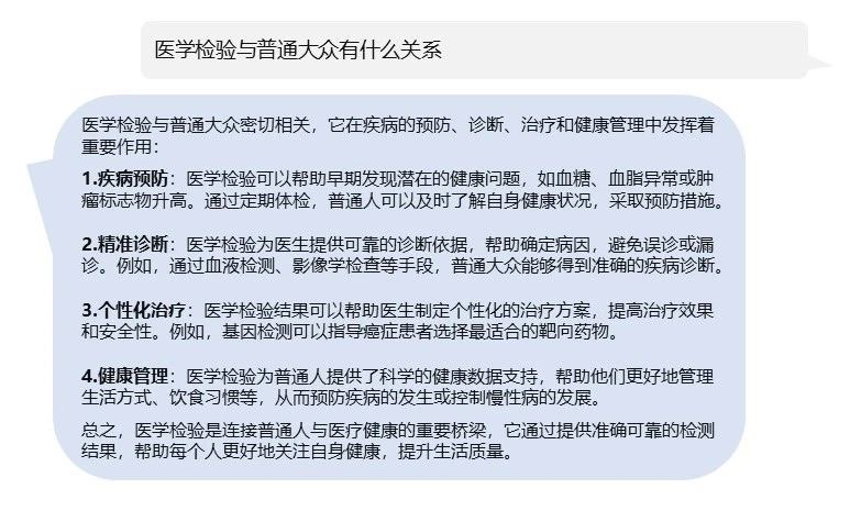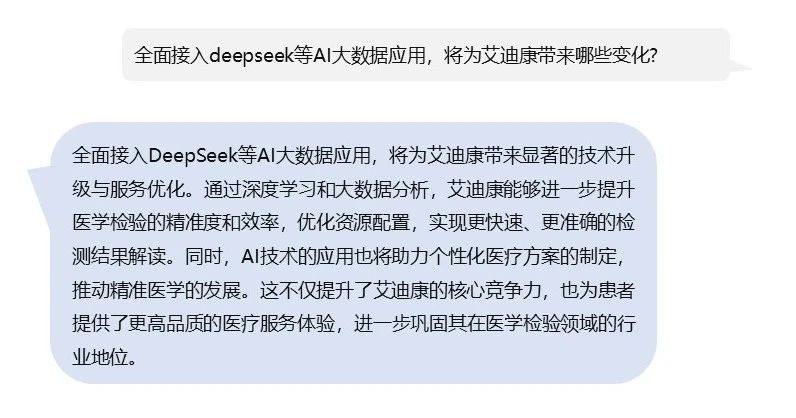 在科技日新月异的今天,人工智能正以前所未有的速度和广度渗透至各行各业,医学检验领域亦不例外。作为国内先行者的第三方医学检验机构,艾迪康凭借其敏锐的市场洞察力和在AI+医疗健康领域的技术储备和布局迅速行动,于2月上旬成功推出了一款基于Deepseek前沿技术大模型的应用。这一里程碑式的举措,标志着艾迪康在医学检验领域积极拥抱人工智能,为推动检验智能化的发展奠定了坚实的基石。