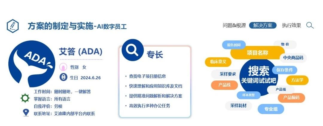 目前艾迪康的三十余家实验室遍布全国,服务着近两万家医疗机构,提供着4000余项检测项目。每天数十万例样本在艾迪康的实验室中流转,为患者的健康保驾护航。这些庞大的数据资源,不仅提升了诊断精度,也为下一步AI应用和智能化产品的研发提供了坚实的基础。如此庞大的业务规模,同时对艾迪康的运营效率提出了极高的要求。为此,艾迪康内部研发了多个数智助理,如艾易助、IT服务工单、艾小赢、ADA等,为全体员工提供了更为迅速、专业的工作支持。这些数智助理的应用,不仅提高了艾迪康的运营效率,更提升了员工的工作满意度和归属感