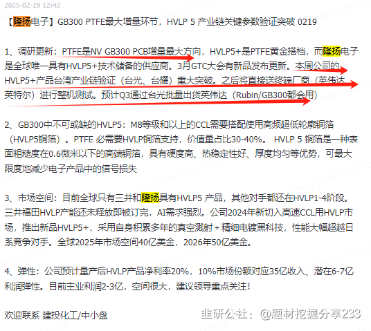 PTFE是NV GB300 PCB增量最大方向,HVLP5+是PTFE黄金搭档,而降扬电子是全球唯一具有HVLP5+技术储备的供应商。3月GTC大会有新品发布更新,本周公司的HVLP5+产品台湾产业链验证(台光、台耀)重大突破。之后将直接送终端厂商(英伟法英特尔)进行整机测试。预计Q3通过台光批量出货英伟达(Rubin/GB300都会用)