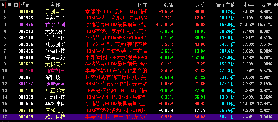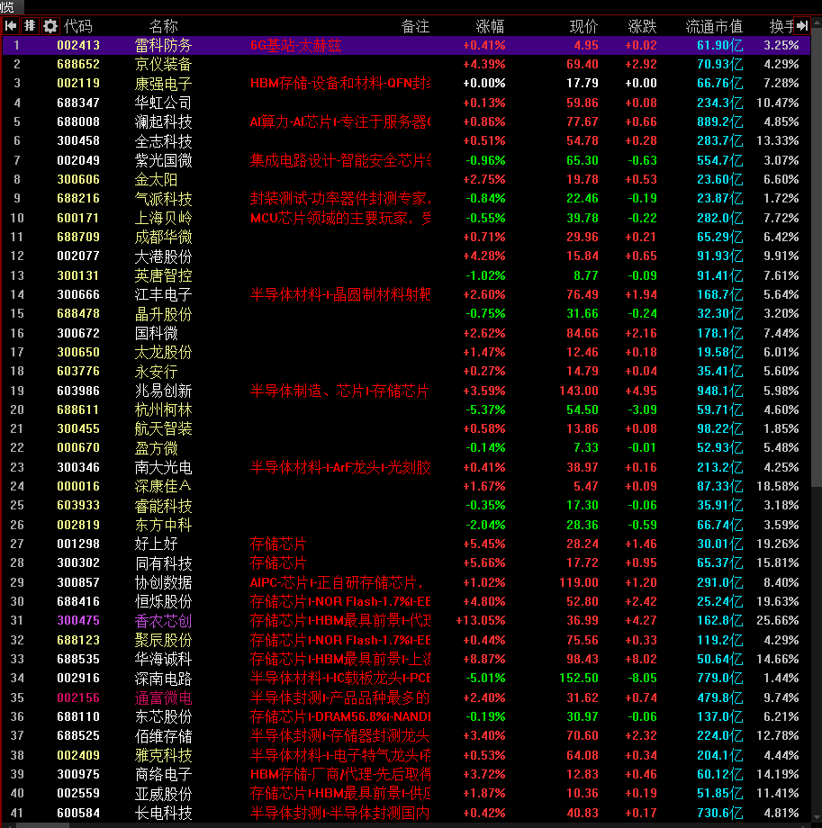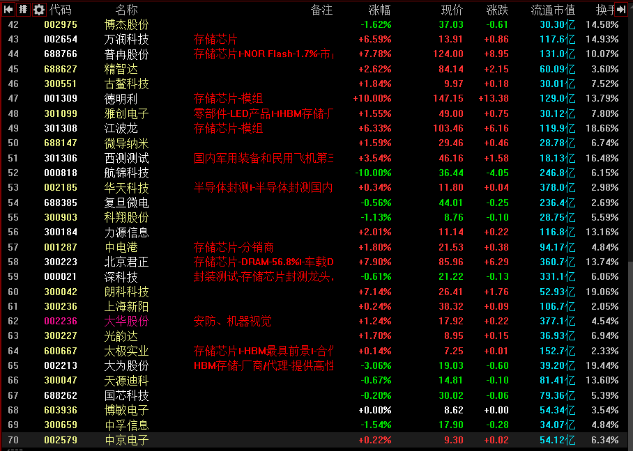 - 核心逻辑:存储芯片分销和方案设计龙头,近期涨幅居前,机构资金持续流入,与SK海力士等国际大厂合作紧密。