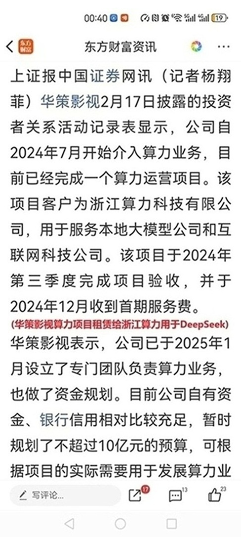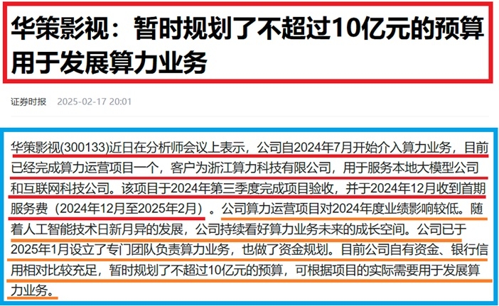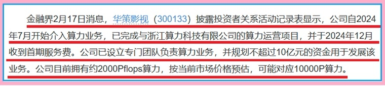 华策影视自2024年7月开始介入算力业务,已完成与浙江算力科技有限公司的算力运营项目,并于2024年12月收到首期服务费。