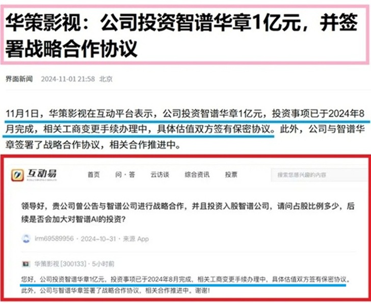 2024年年11月1日,华策影视(300133)在互动平台表示,公司投资智谱华章1亿元,投资事项已于2024年8月完成。此外,公司与智谱华章签署了深入战略合作协议,相关合作正在推进中。