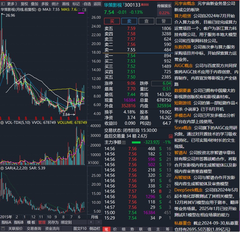 2025年2月19日,华策影视一天内新增算力概念、DeepSeek和腾讯概念。浙江算力、阿里云、之江智算、DeepSeek,均为公司算力租赁用户。