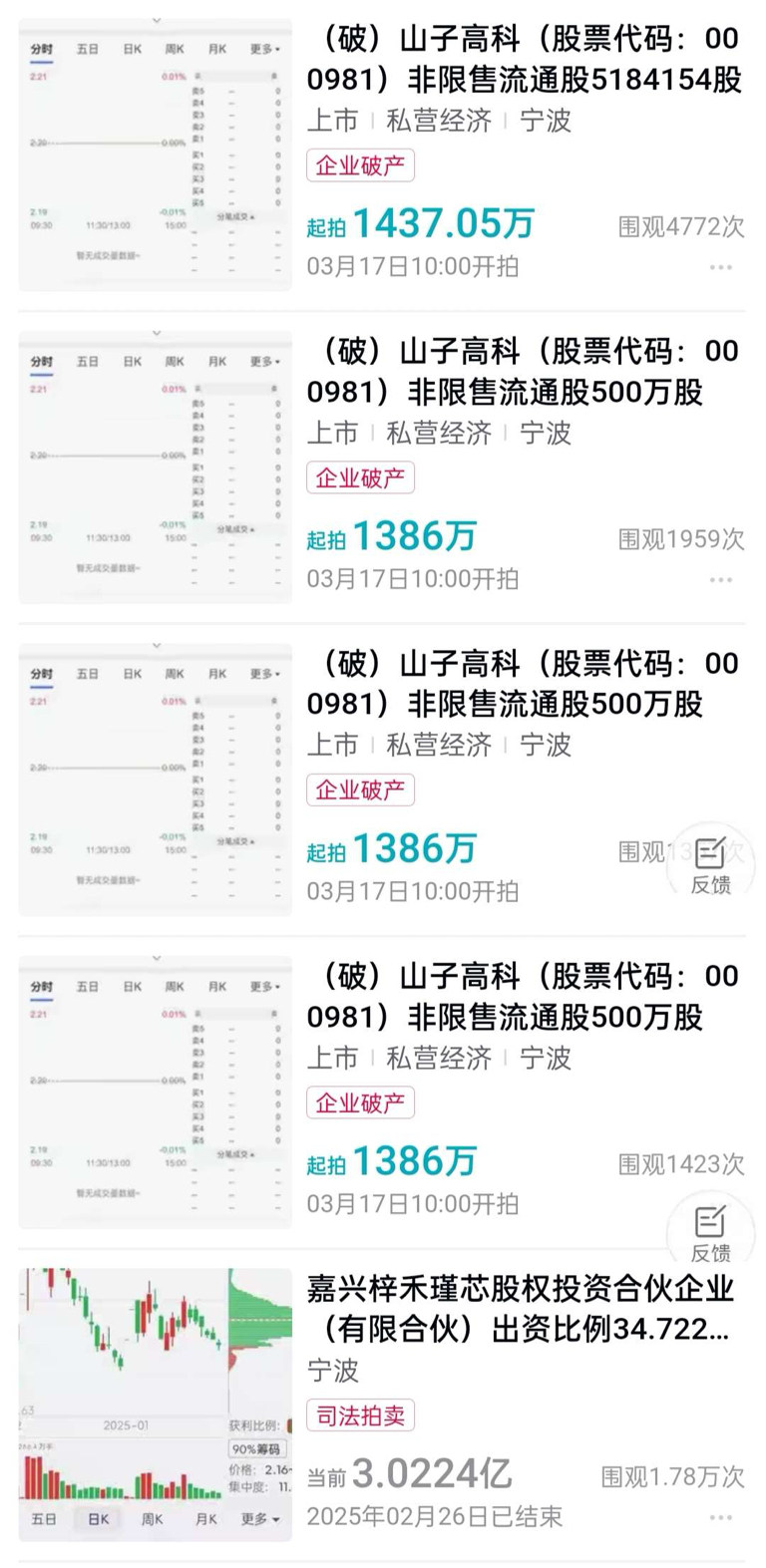 2. 宁波某私营经济实体:挂拍500万股,起拍价1386万元,每股约2.77元,或涉及股东个人债务处置。