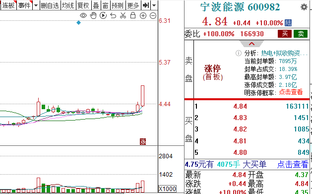 非常漂亮的一根标志性阳线,一阳改三观。在周三已经开始有异动了,昨天是走加速突破。开盘就快速上攻,盘中没有遇到大的抛压,封板也是非常顺畅。在电力板块中,它的走势算是比较活跃的,在昨日电力股中而已是最先涨停。在去年12月份也走出一波短线拉升行情,主要炒作的是并购重组。公司主营是热点联产,抽水蓄能,生物质发电和储能等。公司基本面非常好,多年以来业绩都是保持两位数的增长率,分好比例常年保持达到了4个多点,股息率是同行中基本是最高了。营收超30亿,目前市场才50亿,股价而已只有四块多,市值还有很大提升空间。电力板块在周四逆势拉升,资金流入非常明显。近期横盘震荡区间,资金是逐步流入的。股东人数从去年开始逐步减少,低位筹码集中说明行情即将启动。月线的均和日线均线开始往上拐头,大底部信号 开始明朗了。明天电力股要继续上涨,宁波能源还会是龙头先锋。