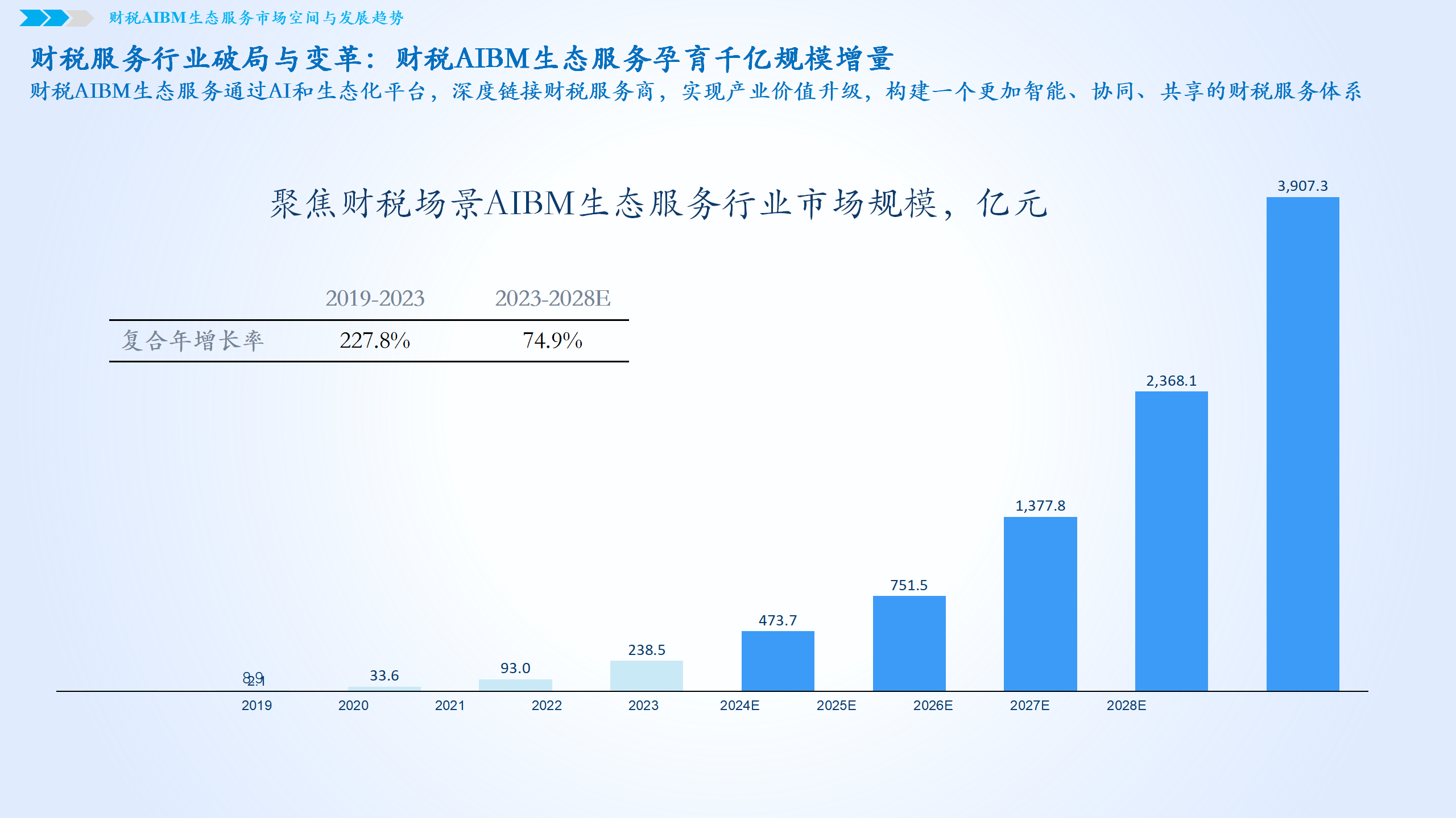 在数字化浪潮和国家财税改革的双重驱动下,财税行业正经历深刻变革,企业财税处理方式面临重塑,财税合规与筹划需求急剧上升,反观行业却长期受限于基础服务价值弱化、数智化水平不足等瓶颈。而财税AIBM生态服务的兴起,通过整合智能引擎、数据管理系统及专业资源,构建全链条智能财税管理体系,有望成为行业升级的核心驱动力。根据白皮书数据,至2028年,国内财税AIBM生态服务行业市场规模将达3907.3亿元,年复合增长率达74.9%。