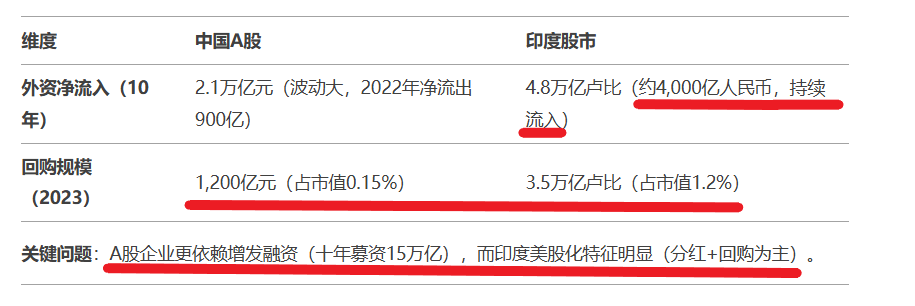 关键问题:重融资、轻回报。A股企业更依赖增发融资(十年募资15万亿)、分红少得可怜,而印度美股化特征明显(分红+回购为主),印度股市10年分红占市值比是中国的8倍,吸引境内外资金长期流入,为股市上涨提供了源源不断的增量资金。