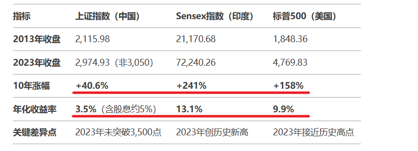 10多年来,上证指数长期跑输印度、美国股市,投资A股获得的收益远远跑输美国股市,甚至经济落后于中国的印度股市。其原因是多方面的,从数据上可以清楚的看出: