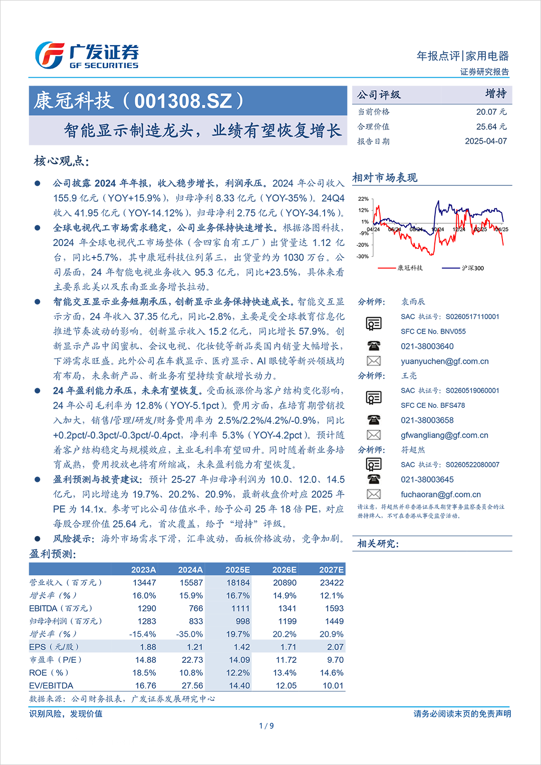 预计25-27年归母净利润为10.0、12.0、14.5亿元,同比增速为19.7%、20.2%、20.9%,最新收盘价对应2025年PE为14.1x。参考可比公司估值水平,给予公司25年18倍PE,对应每股合理价值25.64元,首次覆盖,给予“增持”评级。