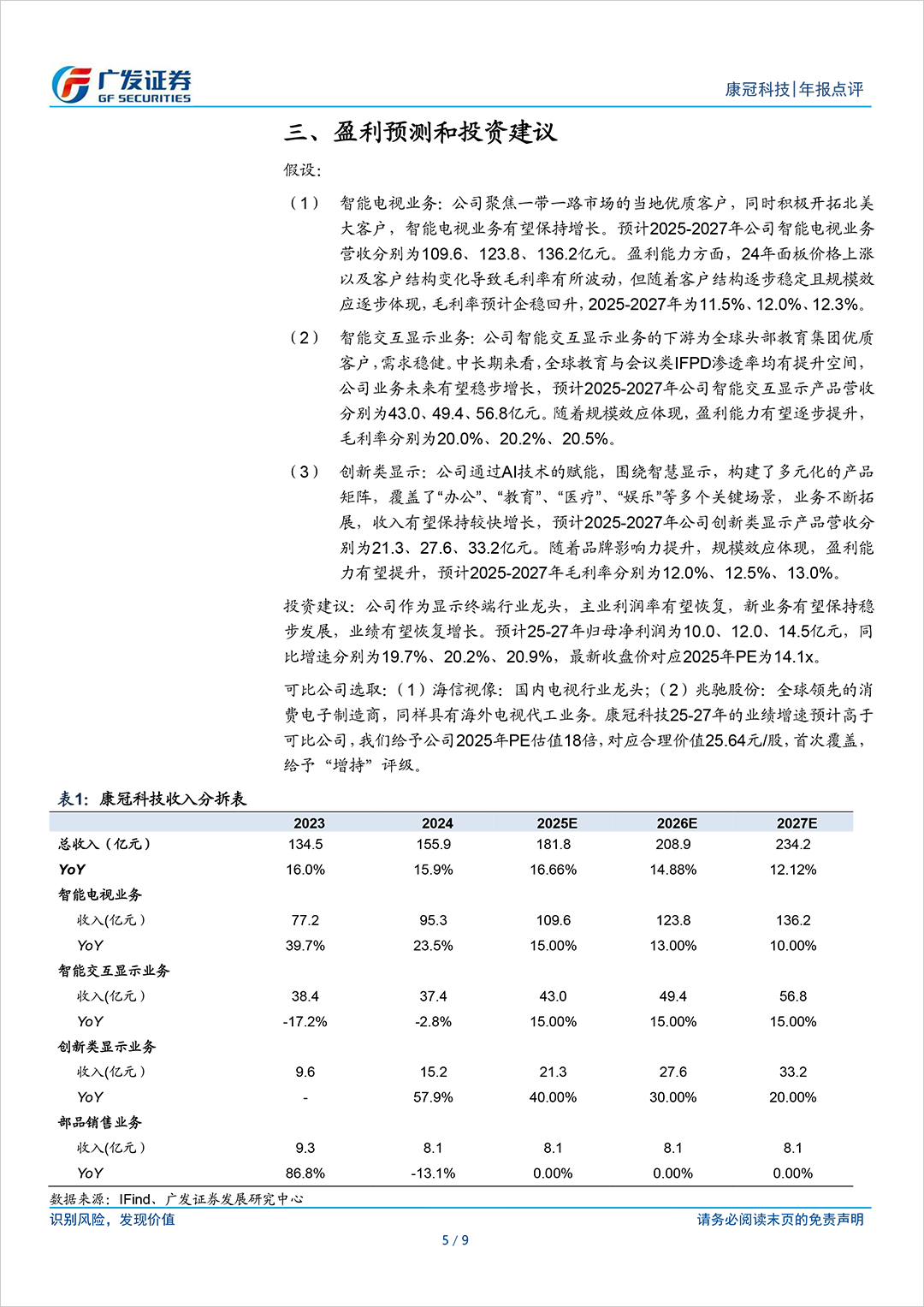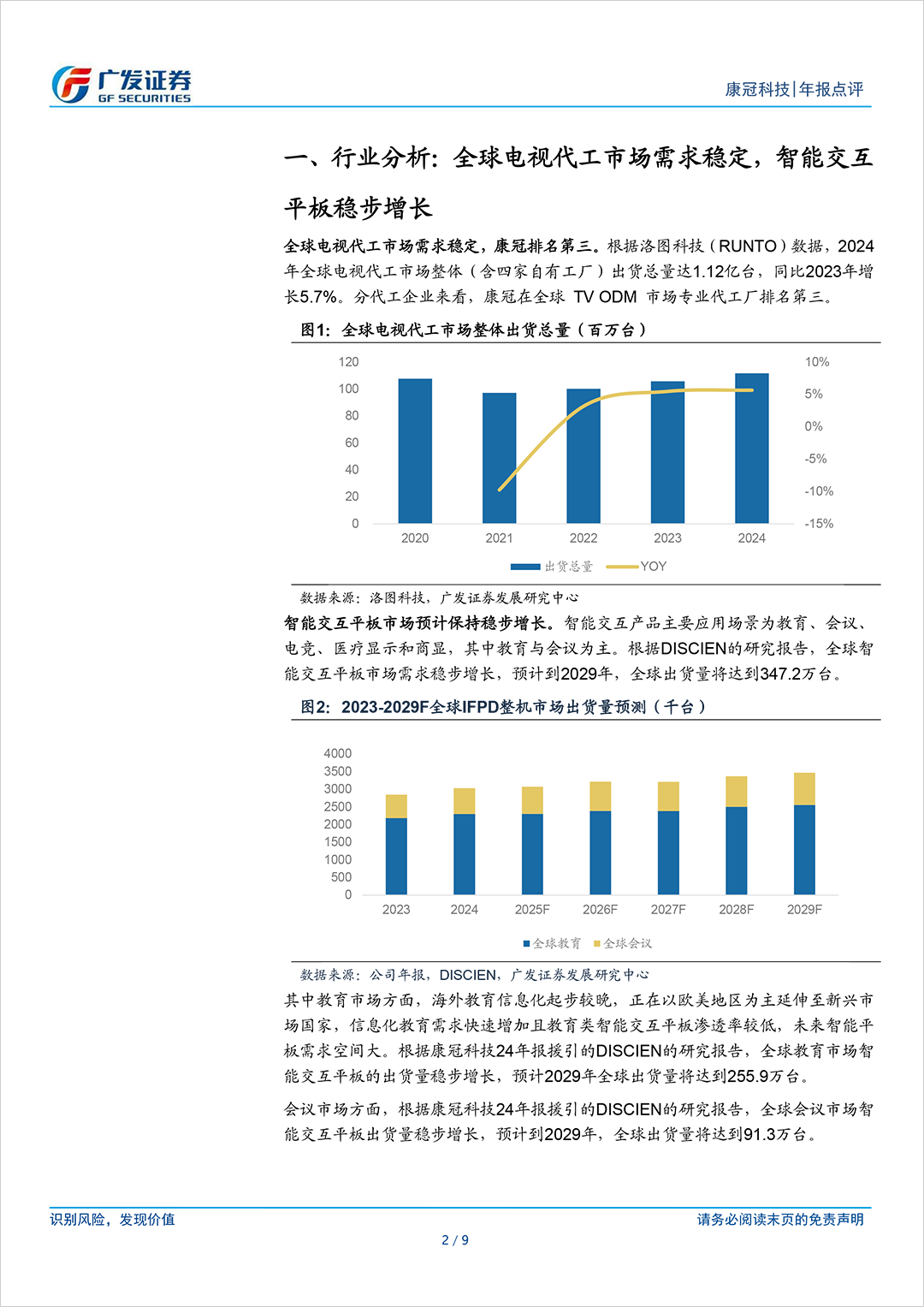 根据洛图科技,2024年全球电视代工市场整体(含四家自有工厂)出货量达1.12亿台,同比+5.7%,其中康冠科技位列第三,出货量约为1030万台。公司层面,24年智能电视业务收入95.3亿元,同比+23.5%,具体来看主要系北美以及东南亚业务增长拉动。