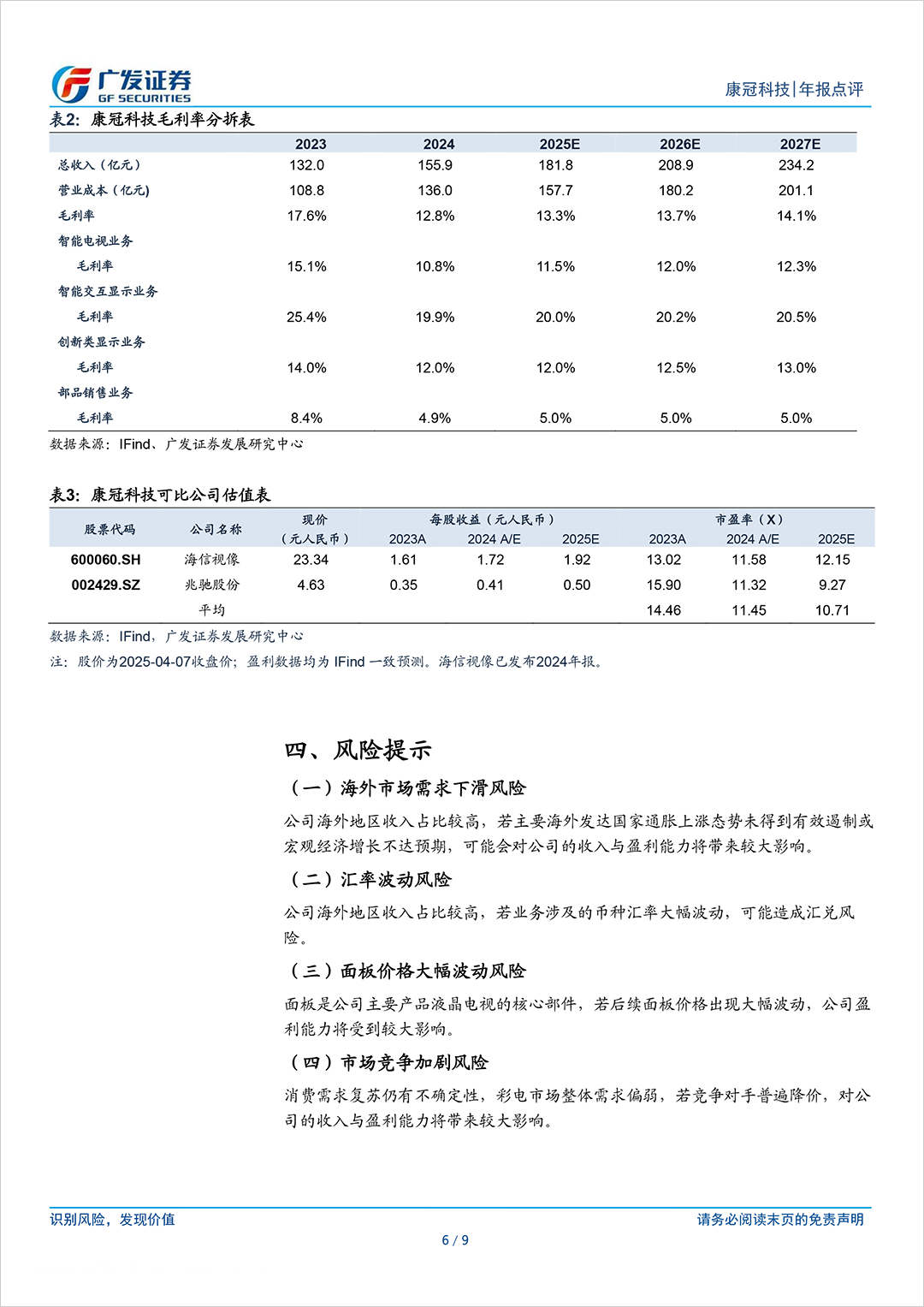 海外市场需求下滑,汇率波动,面板价格波动,竞争加剧。