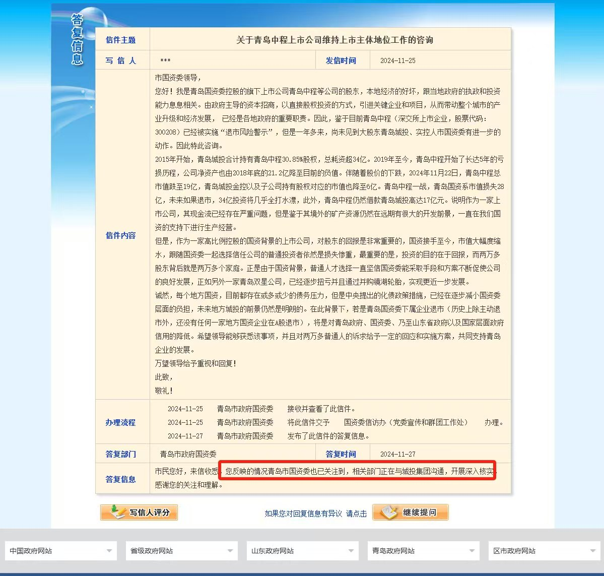 3.其他的一些信息披露原因,因为和贾家不和一直是城投多年的噩梦,贾家是个吃里扒外的家伙,城投尽心尽力,他们一个劲的掏空国资,结果菲律宾延期支付,17年,21年,24年中接连丢失三个矿,另外3个矿还没开采,就算开采的BMU矿大客户也是青岛国资委的,相当于左手右手关联交易,所以青岛在海外是最失败的投资,说多了,这里很多公告和内容与贾家有关,这里面的信息披露只要你深抓,还是能揪出一两个,还有就是贾家去向证监会举报,也有可能,鱼死网破,但应该不至于,这也是他老爸一手创立的公司不可能退市,并且自从三季报投了反对后,其他所有的投票均是同意,他和国资的态度应该缓和了不少。30%概率,我倾向于这个
