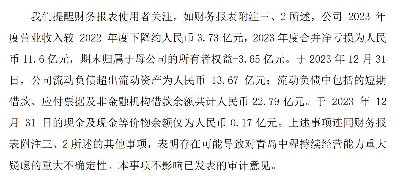 持续经营不重大性,这个就看审计机构了,因为免债后净资产转正,而且近期签署了合同证明了其可持续性,不过摘帽已经不重要(后续立案告知书也有可能继续带帽)。