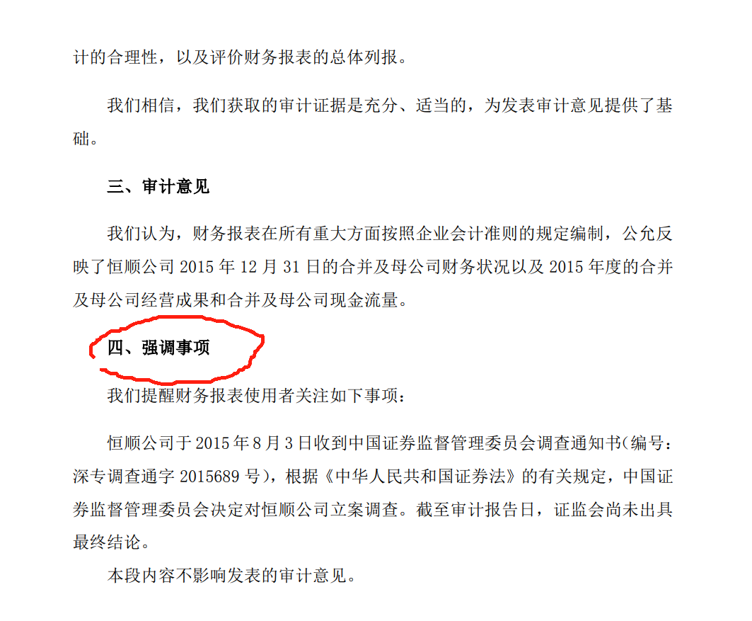 对了,有人说,因为立案事务所会出保留意见,这个没有必然相关的消息。举例子,15年中程的年度审计报告也有立案,最后就是强调事项,大家也可以找一下其他有立案然后正常审计报告的