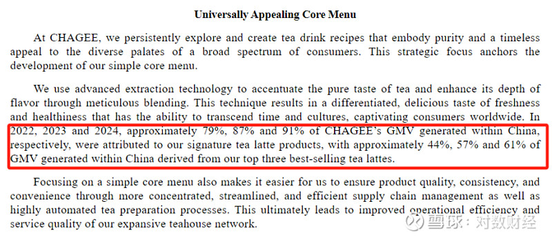 根据招股书显示,2022,2023,2024年,霸王茶姬在中国市场分别有接近79%,87%,91%的GMV来自招牌tea lattes产品,其中约44%,57%,61%的GMV来自其最畅销的三款。