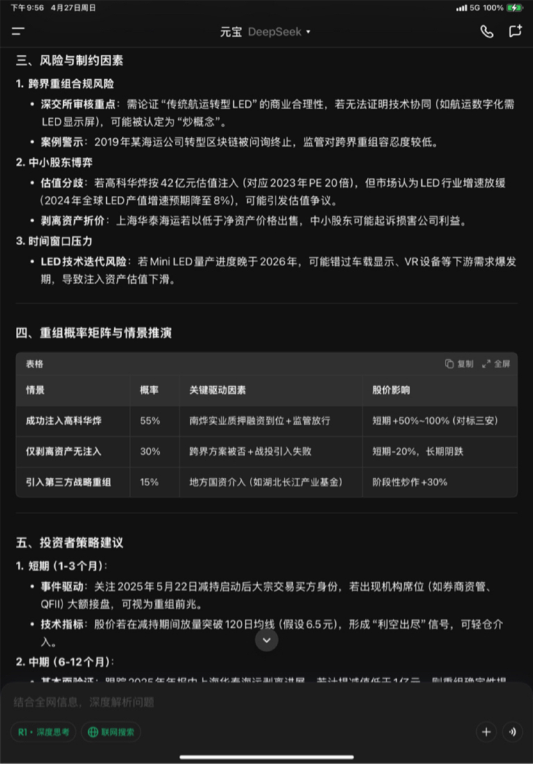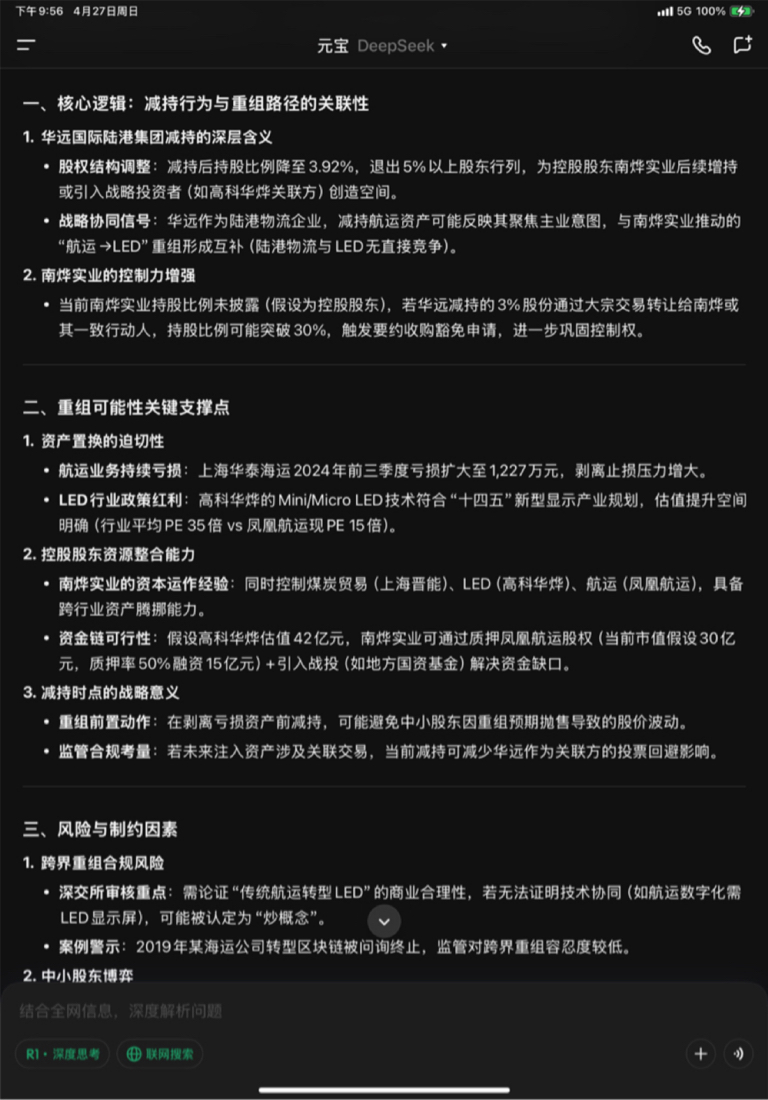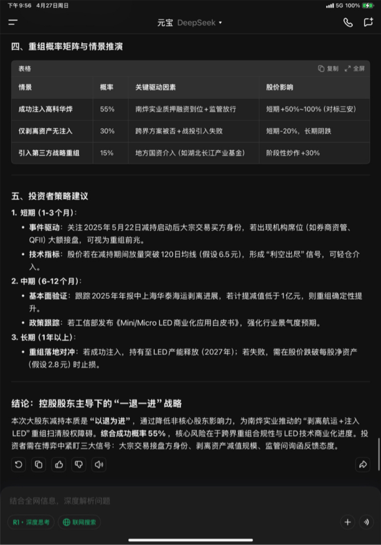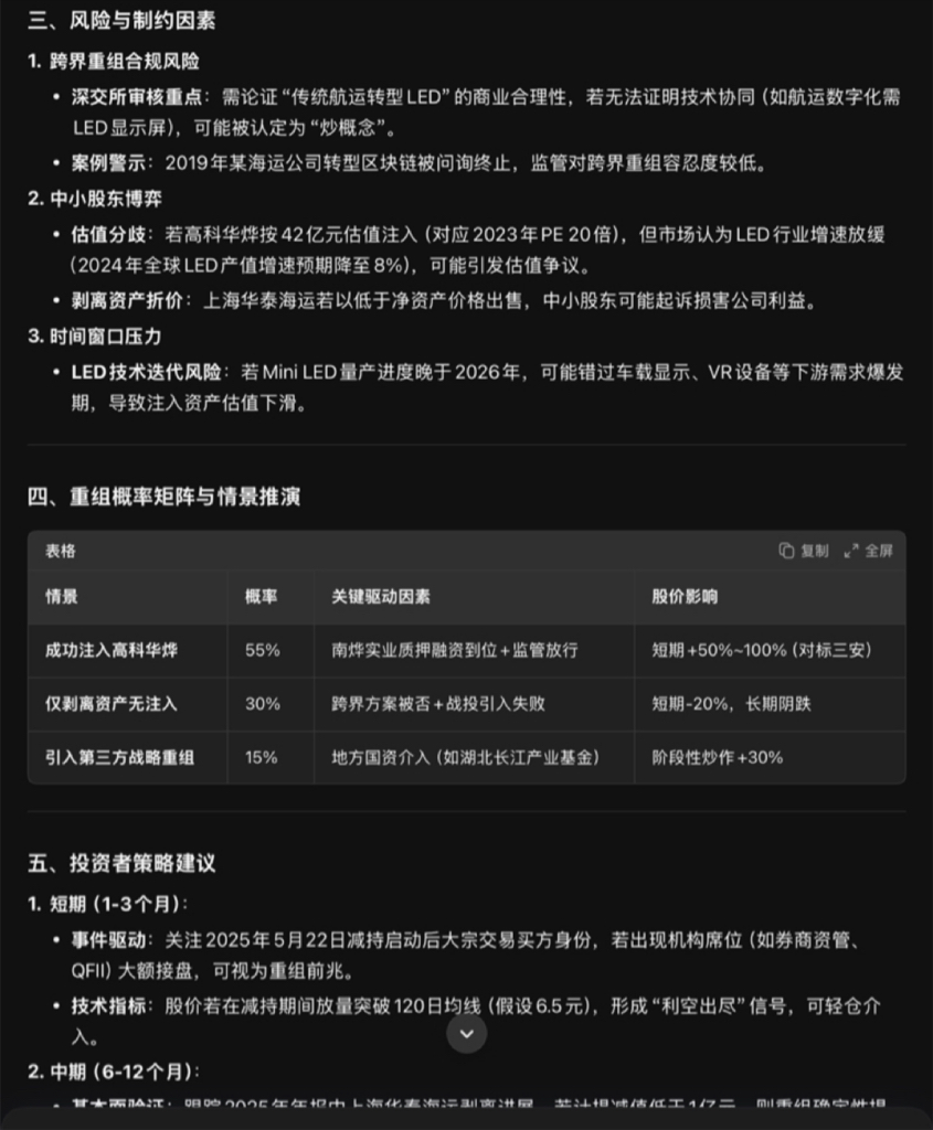 本次大股东减持本质是 **“以退为进”** ,通过降低非核心股东影响力,为南烨实业推动的“剥离航运+注入LED”重组扫清股权障碍。**综合成功概率55%** ,核心风险在于跨界重组合规性与LED技术商业化进度。投资者需在博弈中紧盯三大信号:大宗交易接盘方身份、剥离资产减值规模、监管问询函反馈态度。