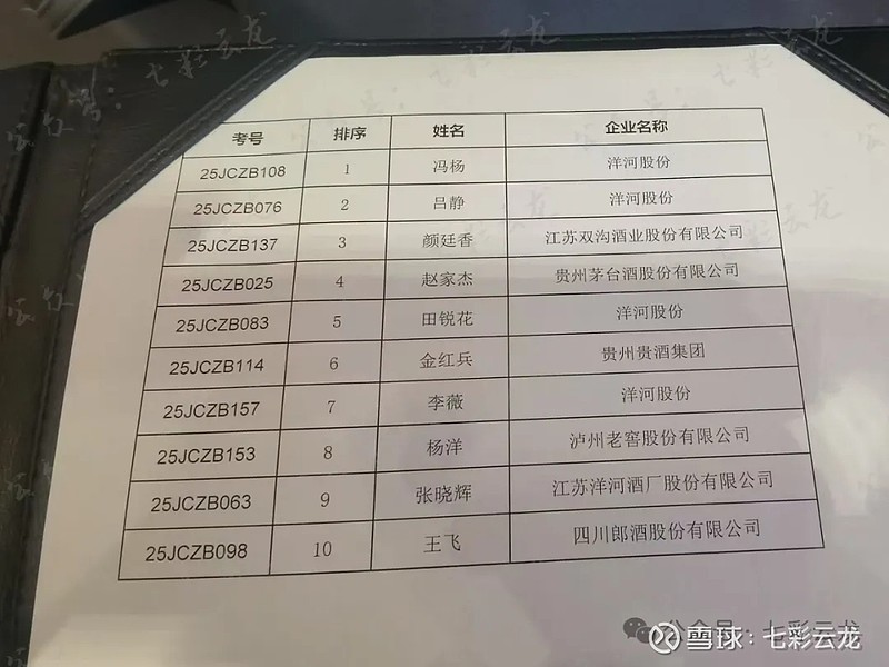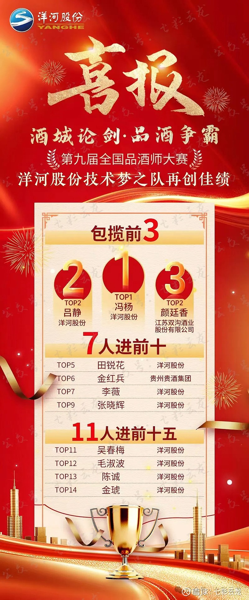 在剩下的3个名额中分别来自于$贵州茅台(SH600519)$、$泸州老窖(SZ000568)$、郎酒。前面说了参赛选手是来自全国知名酒企的200余名品酒师。所以不是因为别的酒企没有参加,而是洋河人太过优秀:在前十五名中有11名都来自于洋河: