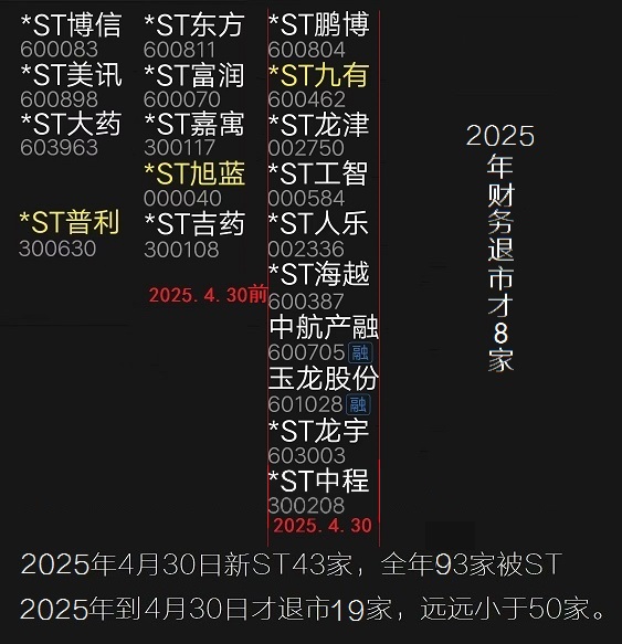 2025年和2024年神相似,到5月1日都只退了19家,五一财务退市都是8家。唯一不同的就是经过去年下半年的上涨,接近1元的ST股票比去年少很多了。如果2025年1元退要和去年接近的话,管理层在5月和6月势必要下狠心下杀1元股,请大家小心!