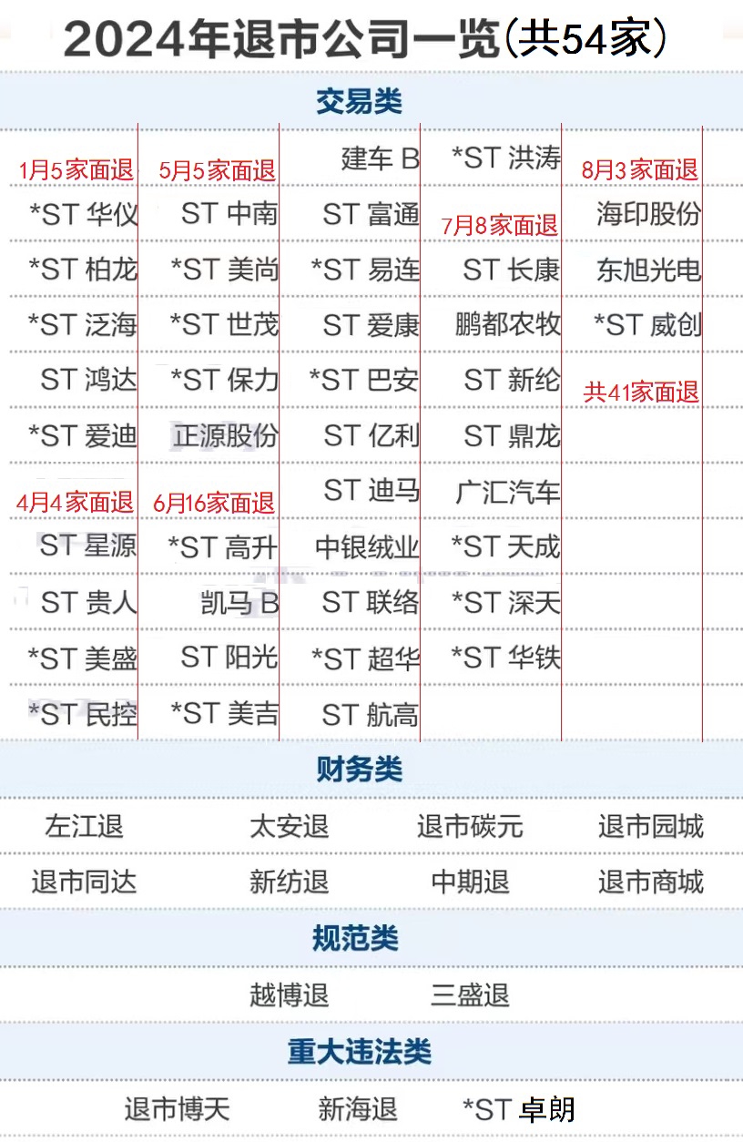 2024年退市股一览。2024年面退41家!2025年还差30只面退缺口!大家小心!