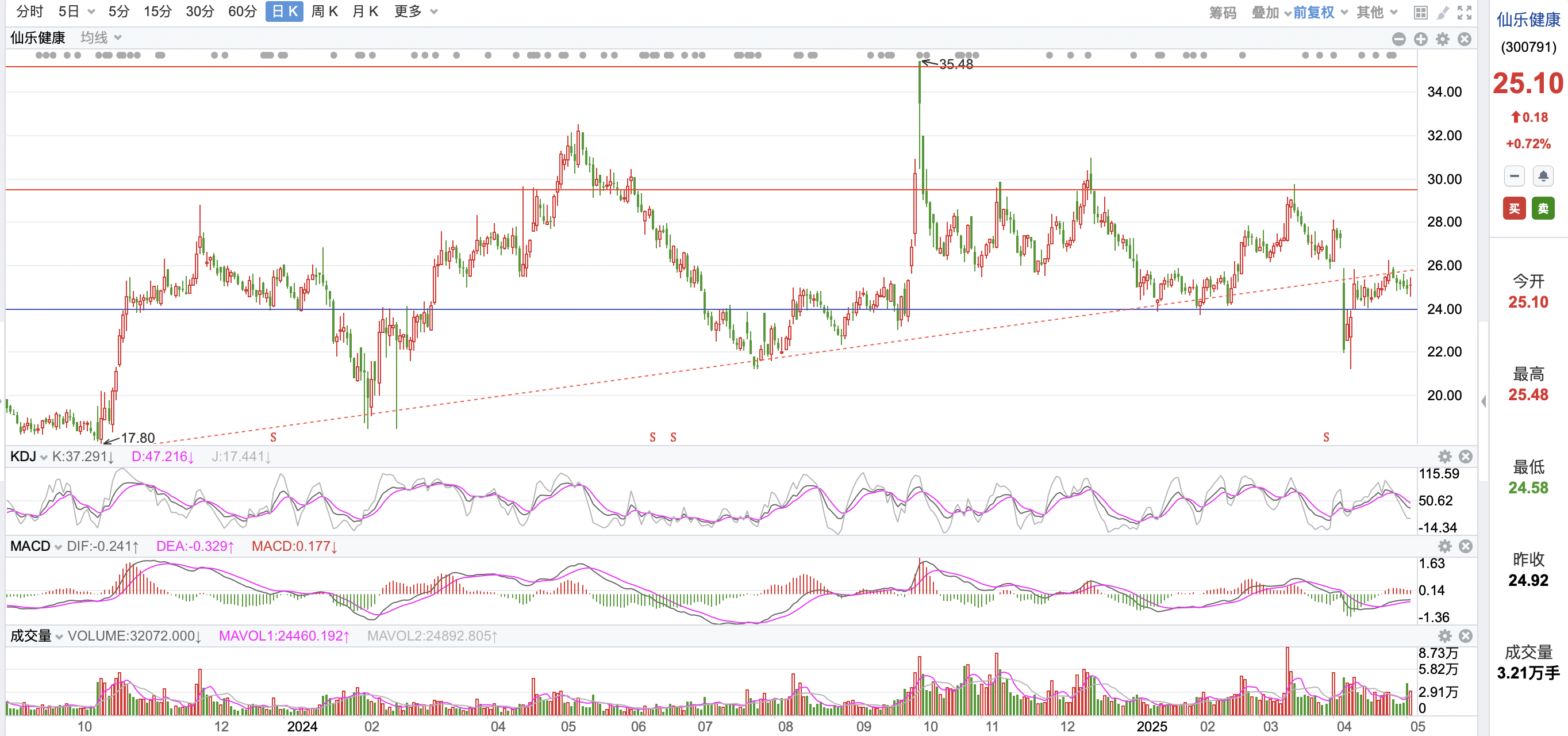 之前写的这篇,三支里先做了$仙乐健康(SZ300791)$,可以在上个月5月15日的长文中查看,从25到30差不多20cm挺舒服的(设置不复权看股价)。