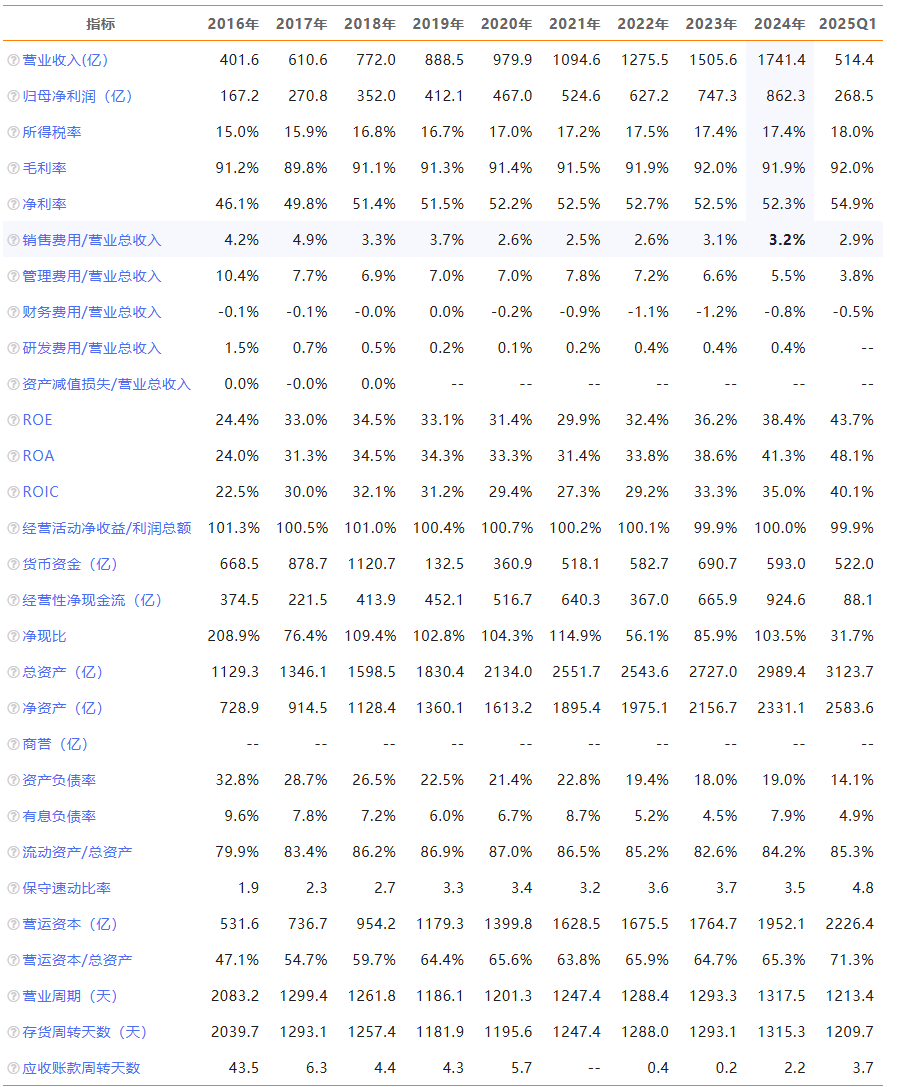净利润提升:2016-2024 年净利润 CAGR 约 20%,2024 年 862.3 亿,2025Q1 268.5 亿(年化 1074 亿)。2024 年销售费用率 3.2%(行业最低),净利率 52.3%(2025Q1 54.9%),通过 **“直销渠道占比提升(2024 年 35%)”** 减少中间环节,经营现金流 / 净利润达 100%,利润 “真金白银” 属性极强。