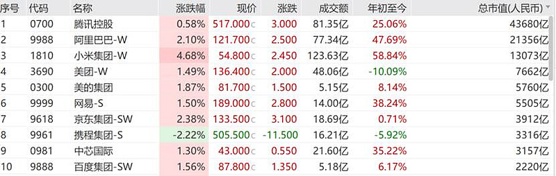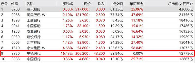 具体到宁德时代:2025年5月20日(宁德时代H股的首个交易日)港股收盘后,宁德时代以总市值12778亿人民币直接排在全港股市值第9名的位置;在恒生科技指数当中,总市值仅次于第三大的小米集团。